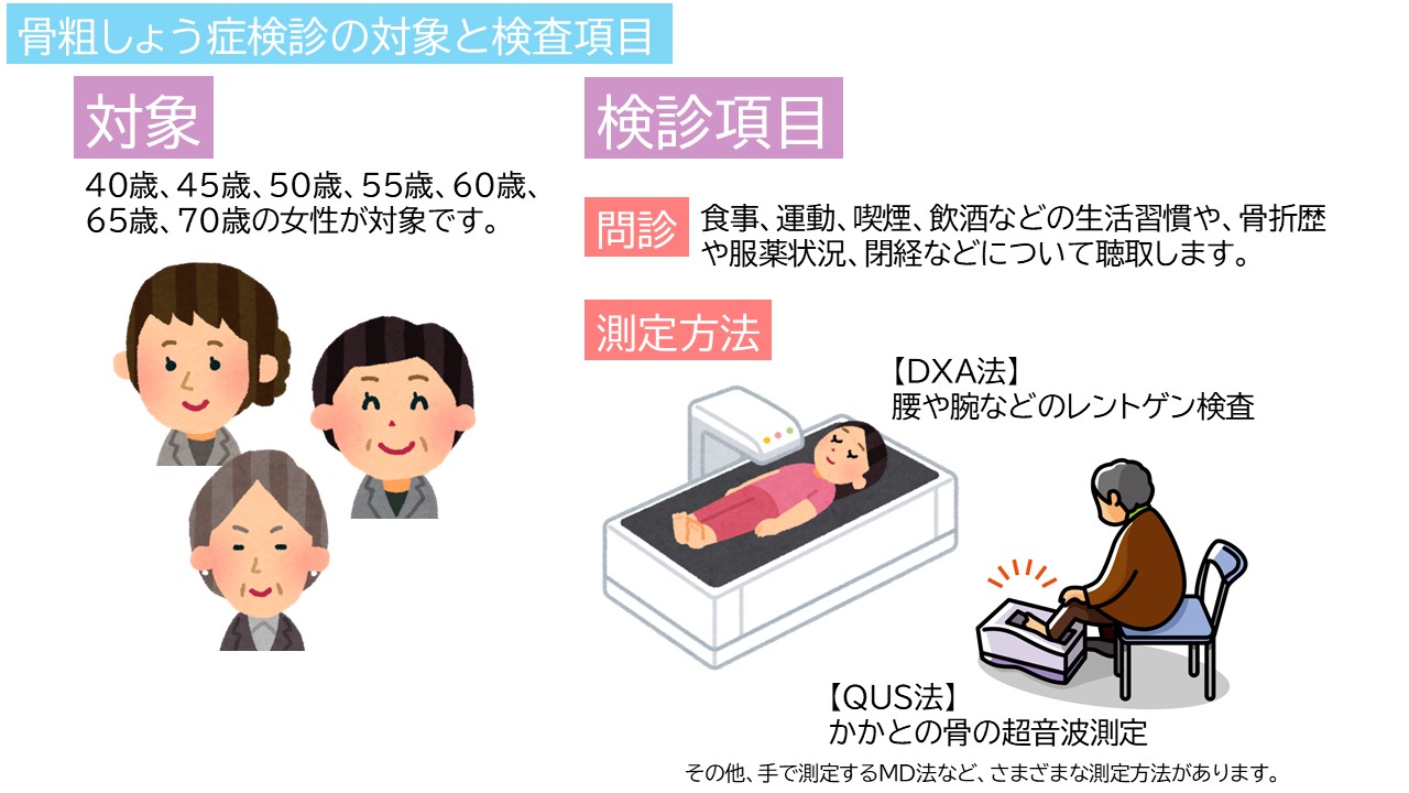 閉経前後の女性は骨粗しょう症の危険が高いため、40歳、45歳、50歳、55歳、60歳、65歳、70歳の女性を骨粗しょう症検診の対象者としています。