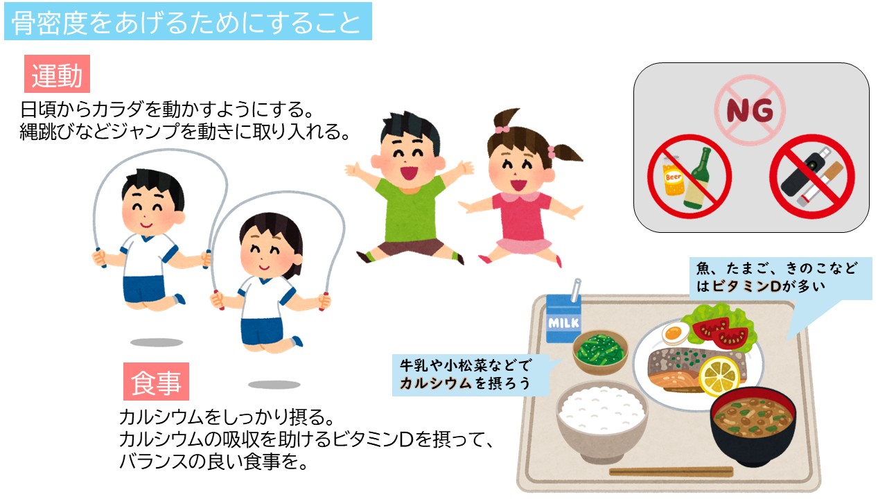 - 骨密度のピークは「20歳頃」です。若い世代の方々は、20歳頃までに骨密度が最大になるように、また、骨密度が急に低下しないように、運動や食事などの生活習慣を整えましょう。